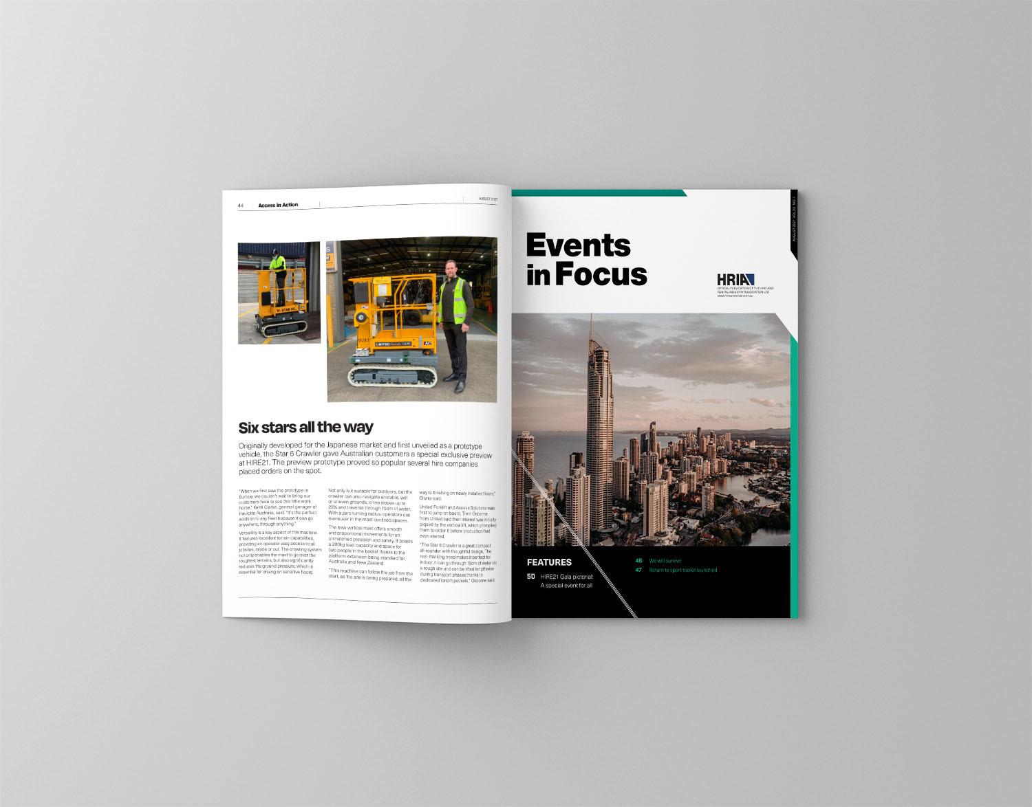 The magazine is divided up into three main sections: Hire & Rental (news), Access & Action, and Events in Focus.